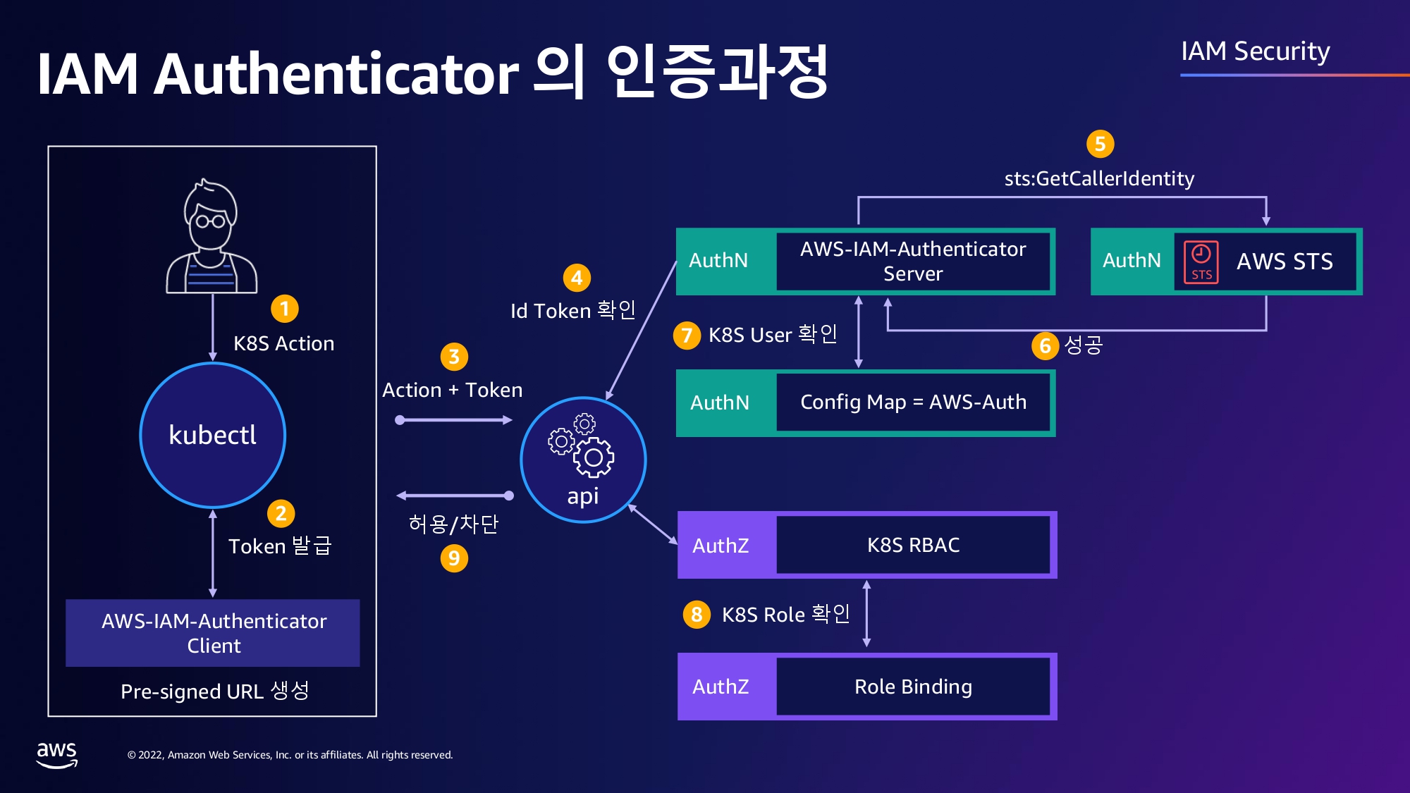 - k8s API 서버는 webhook을 통해 IAM에 인증 요청